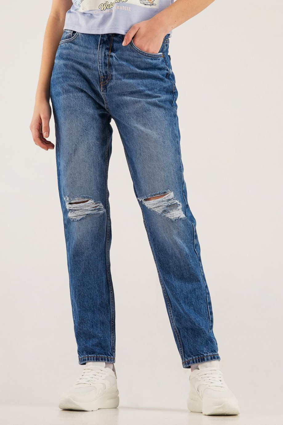 Jean mom fit para mujer, 5 bolsillos, super tiro alto, con proceso azul medio