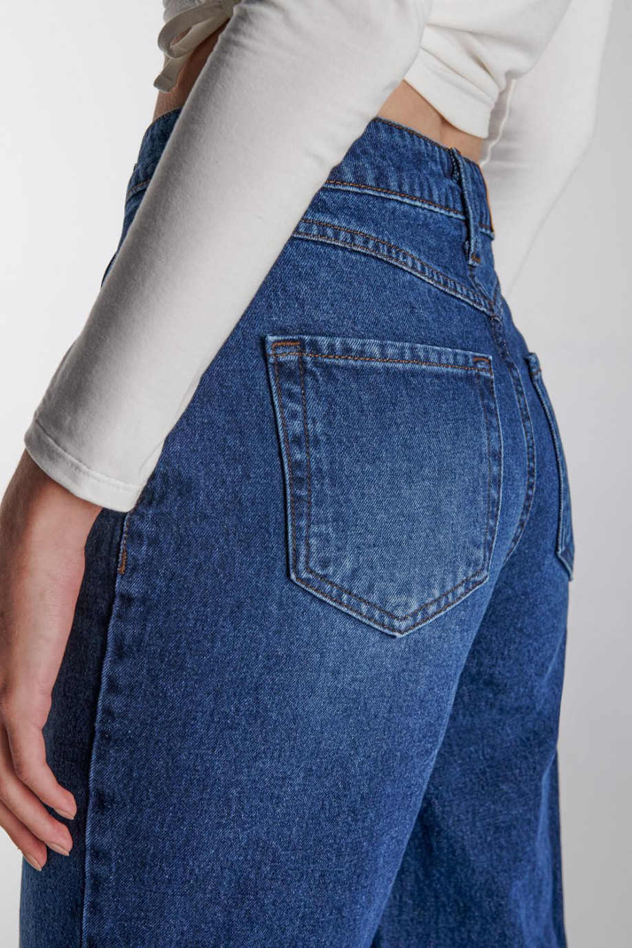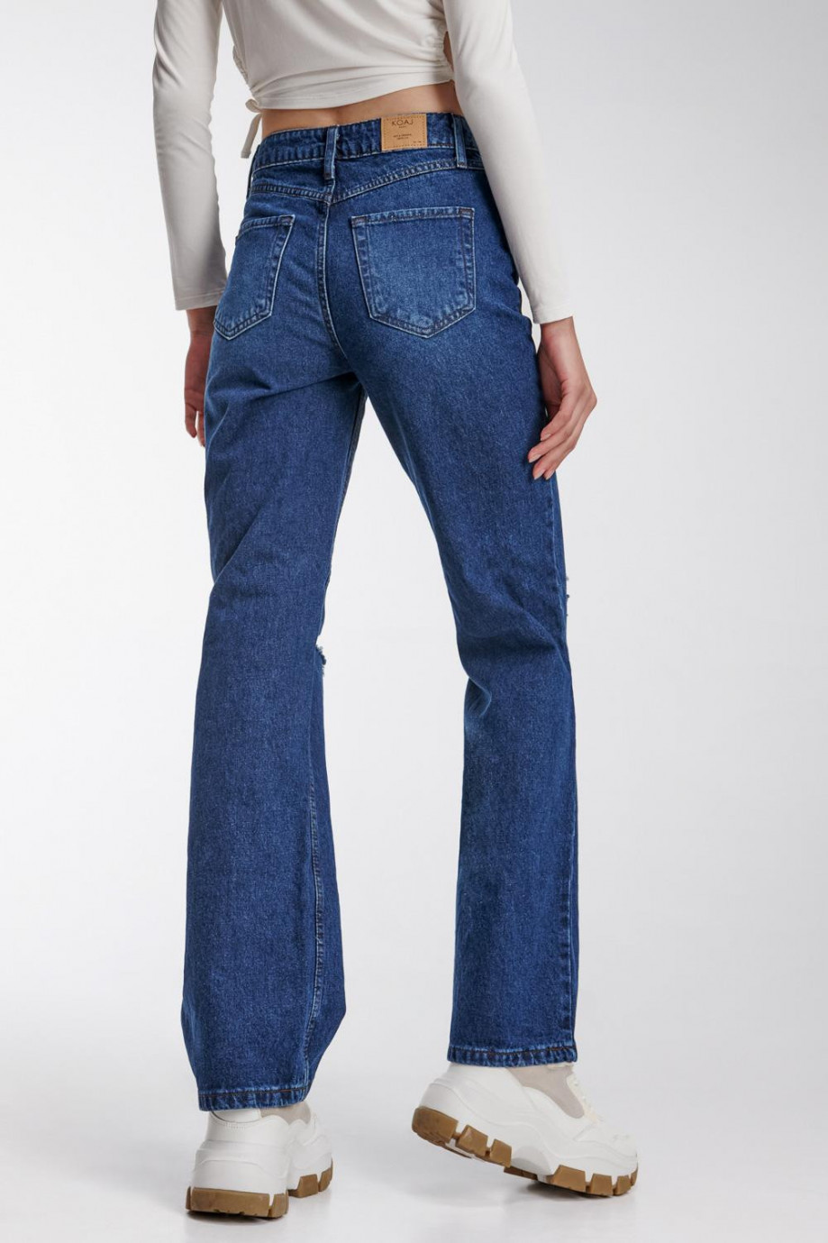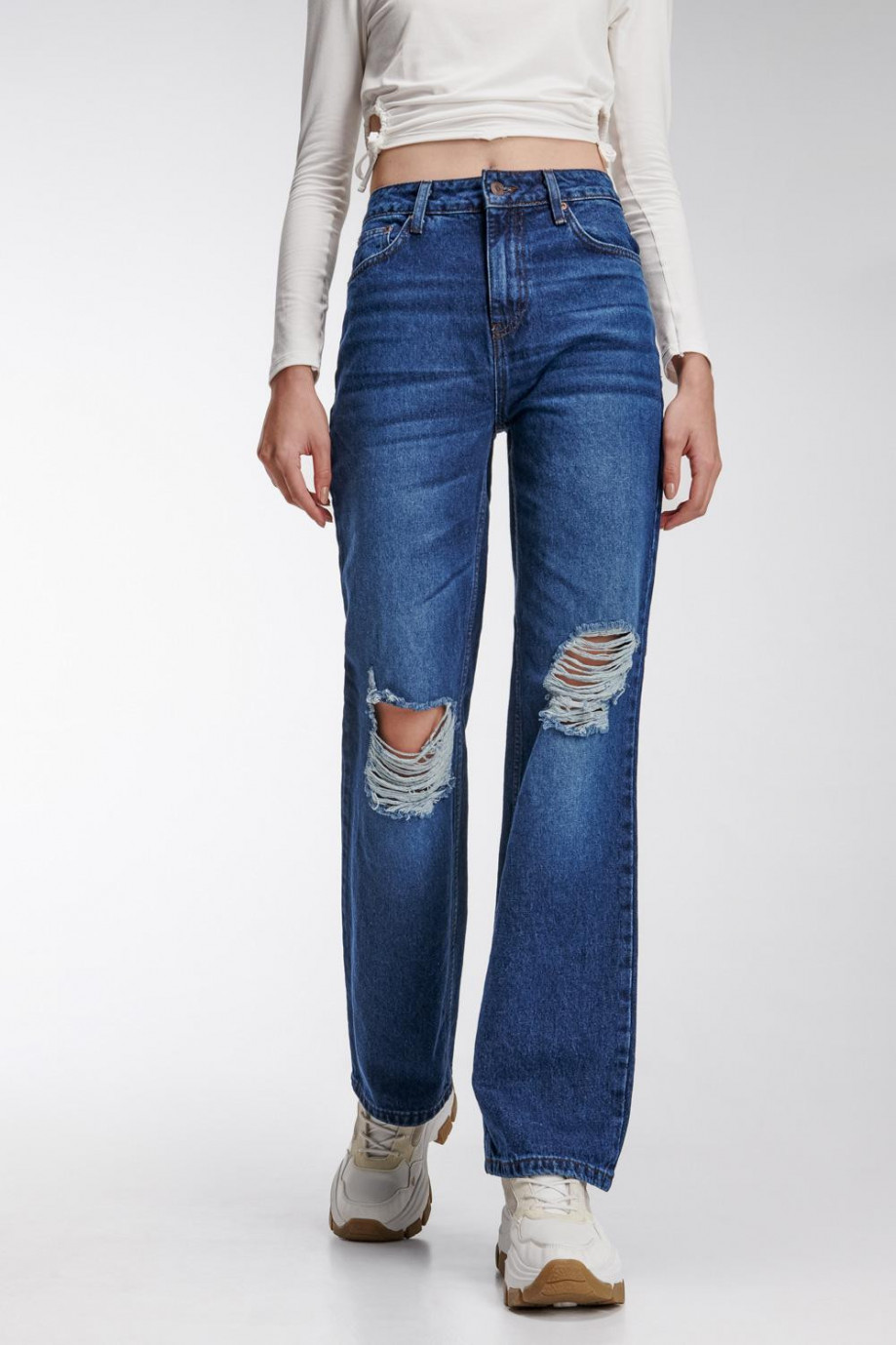 Jean para mujer, 5 bolsillos, tiro alto, lavado con rotos color azul oscuro