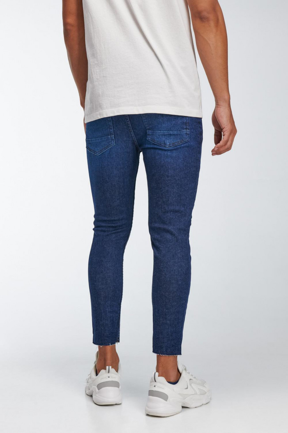 Jean para hombre, 5 bolsillos, tiro bajo ajustado con proceso de laser y lavado oscuro.