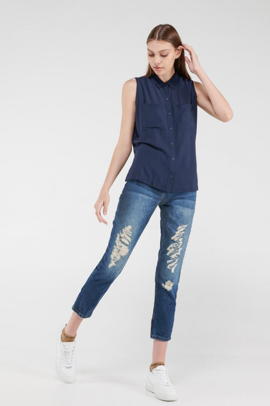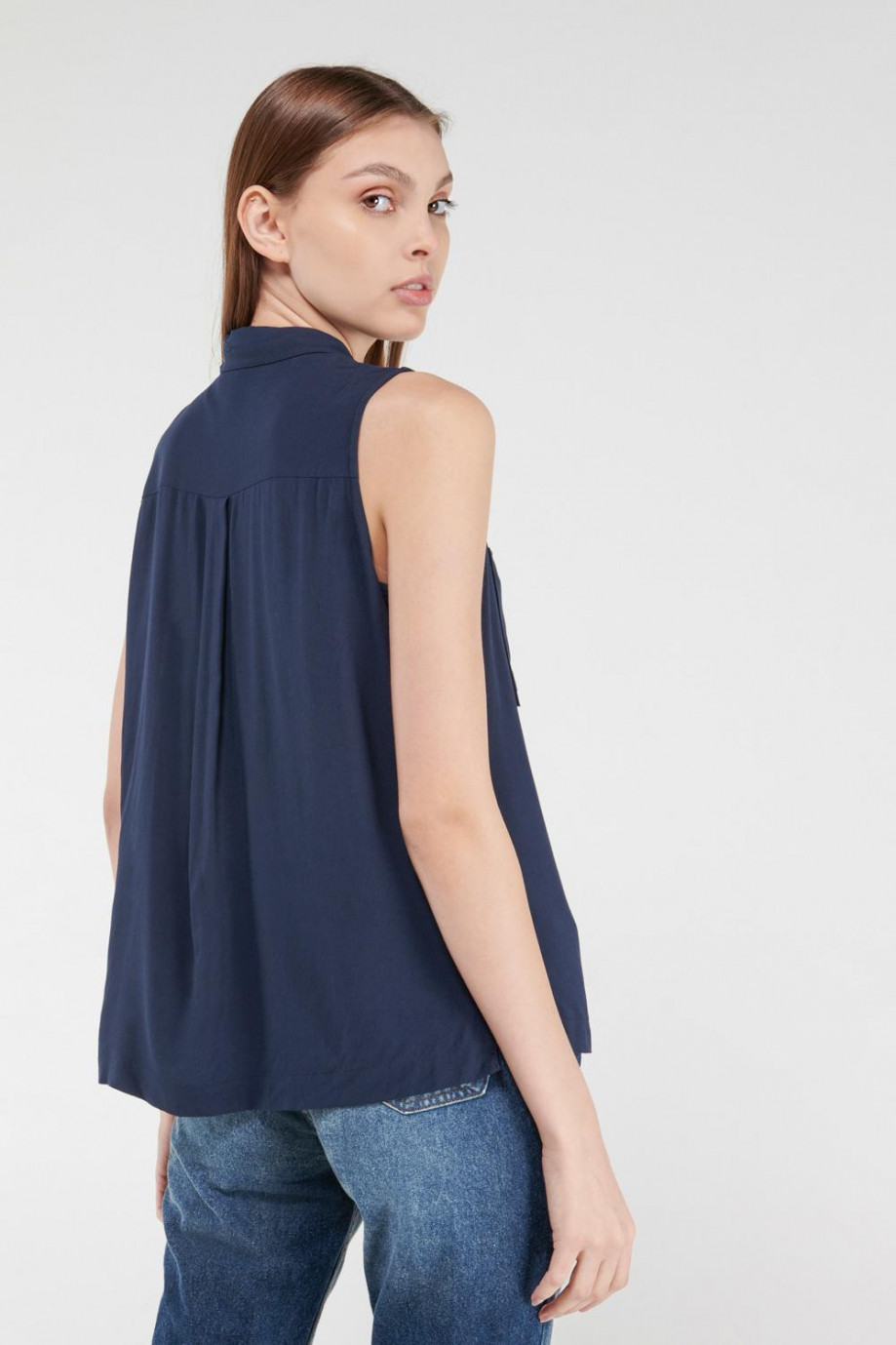 Blusa para mujer en tela fluida, unicolor, con bolsillo, sin mangas, cuello camisero.
