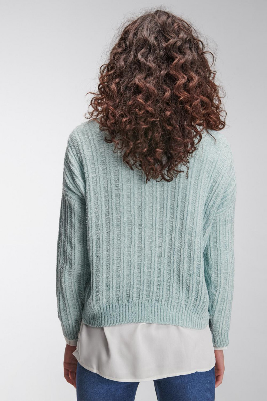 Suéter para mujer, cuello en V, cuerpo tejido unicolor, con hombro caido y silueta holgada.