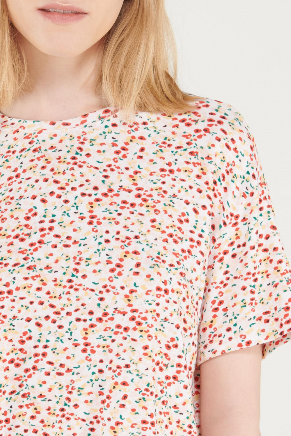 Camiseta para mujer, con estampado de flores, cuello redondo y manga corta.
