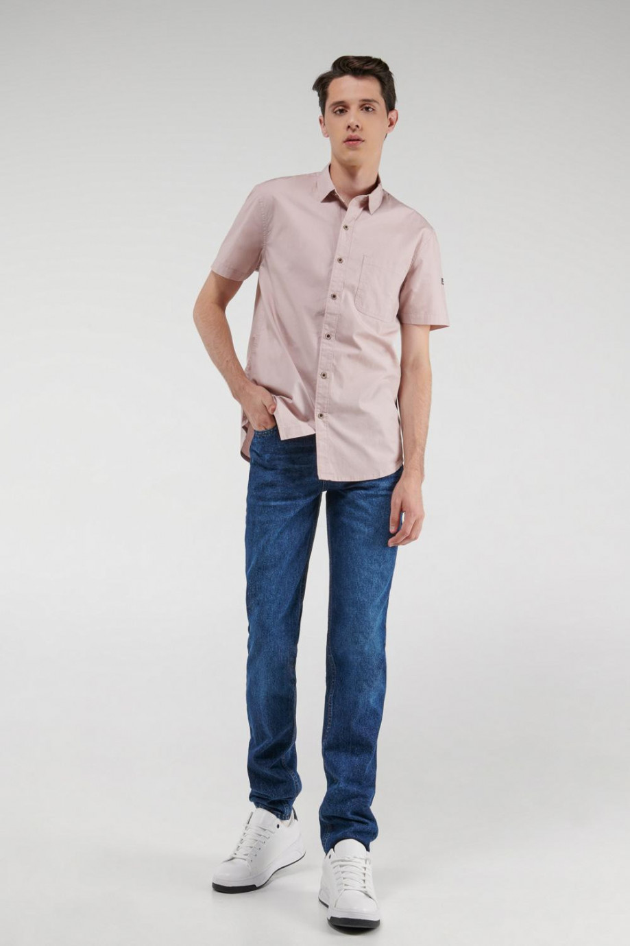 Camisa cuello sport collar con tela unicolor, manga corta con un bolsillo y botonadura en el frente.