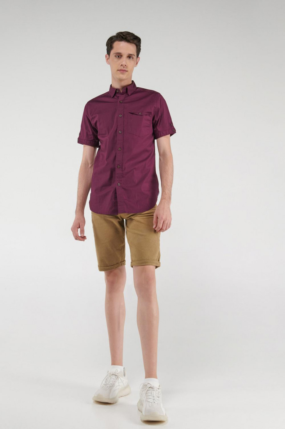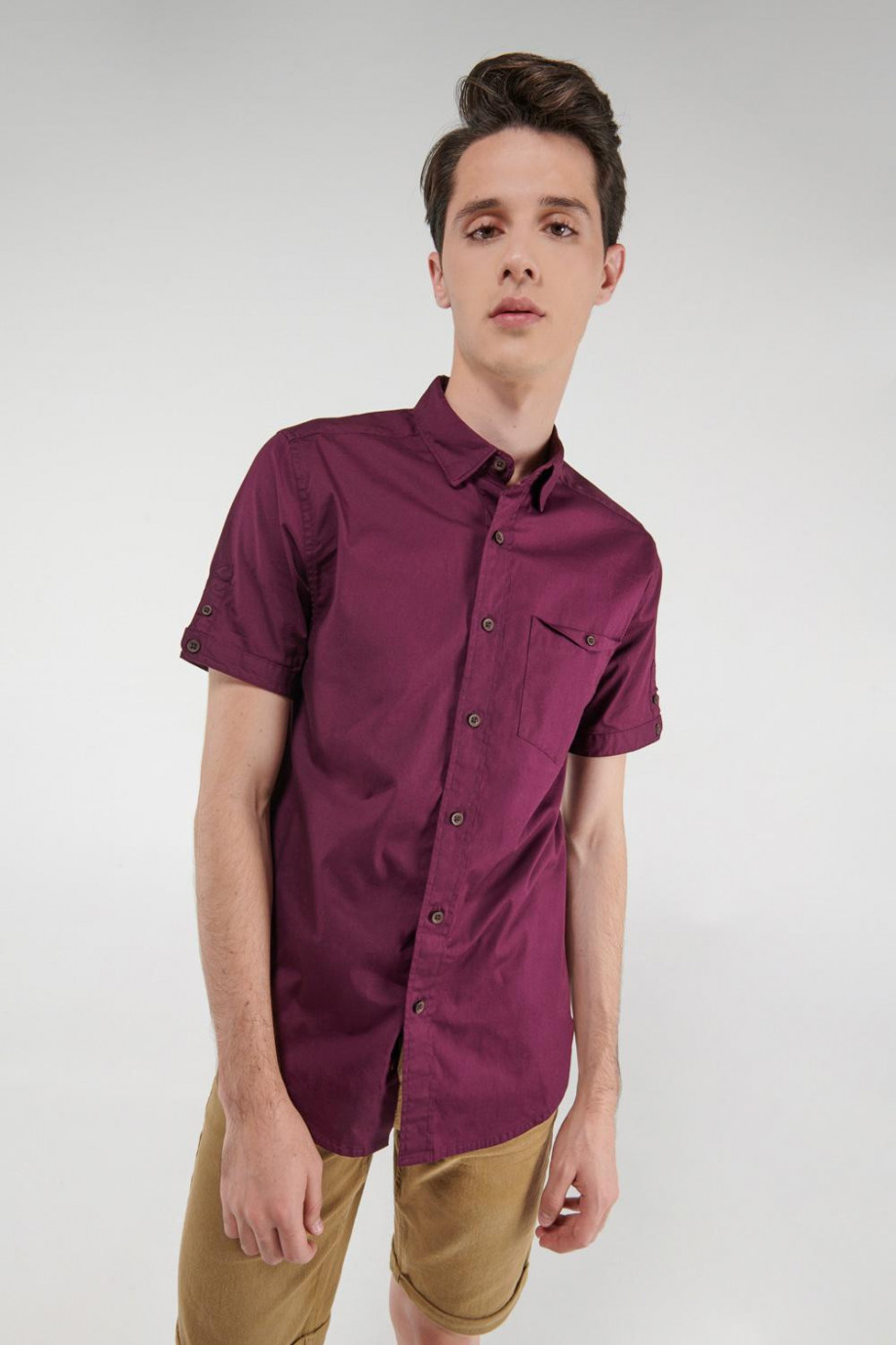 Camisa para hombre, en tela unicolor silueta ajustada, botones no visibles en cuello