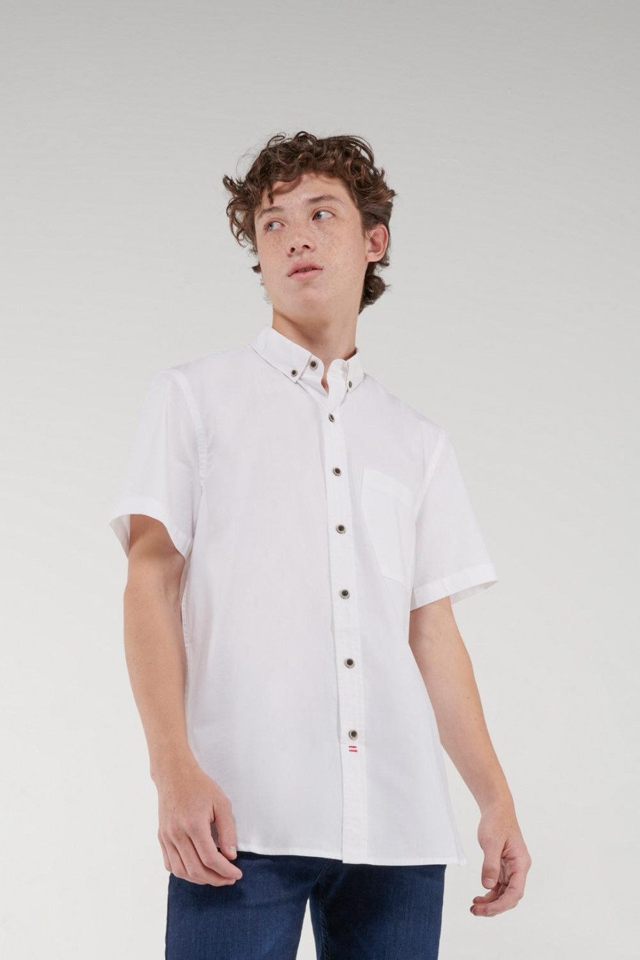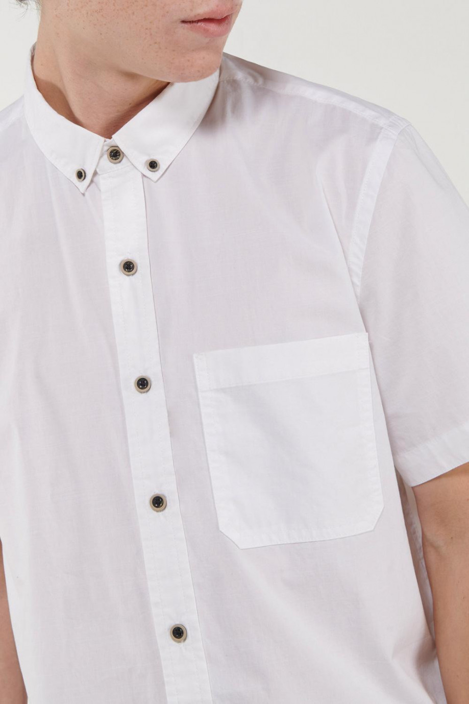 Camisa button down, en tela unicolor con un bolsillo y botonadura en frente