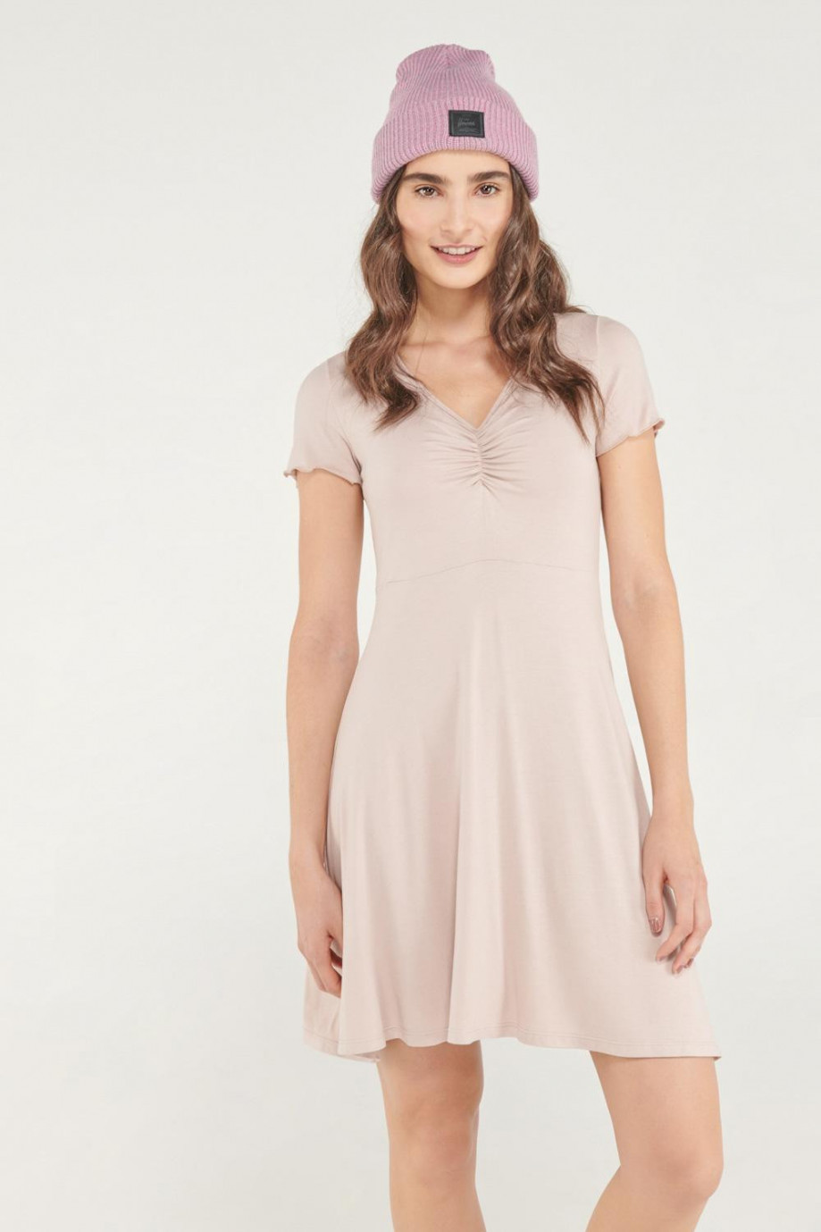 Vestido corto para mujer manga corta, unicolor con escote en V.