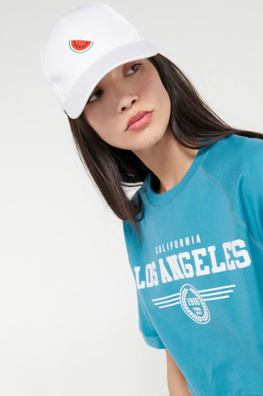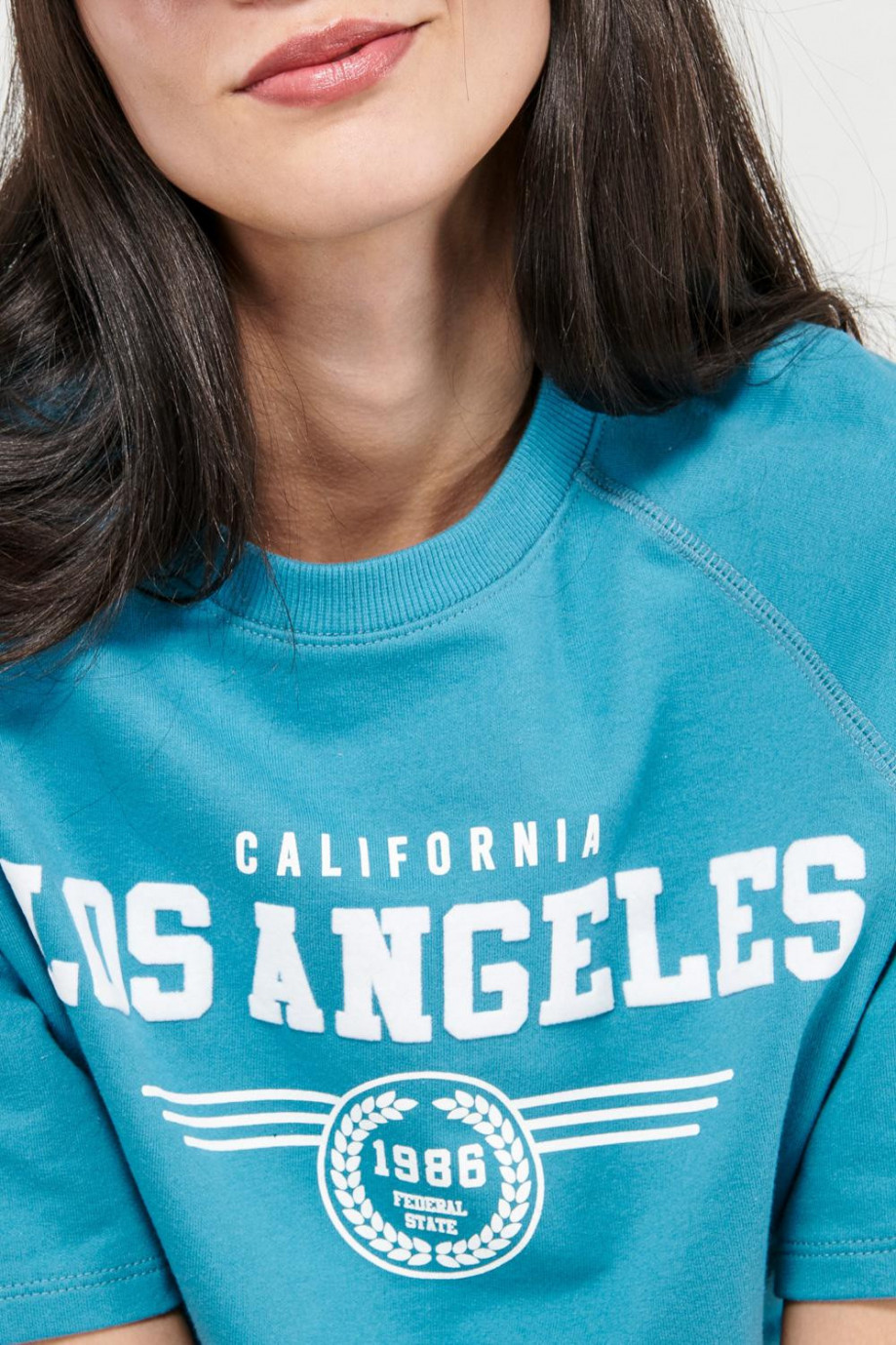 Camiseta manga ranglan corta, para mujer juvenil, con estampado en frente.